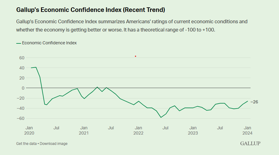 Januars målinger er –26, seks poeng høyere enn forrige måned og den høyeste siden januar 2022, skriver Gallup.