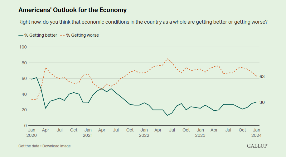 45 % vurderer økonomien som dårlig; 63 % sier at den er blitt verre, ikke bedre.