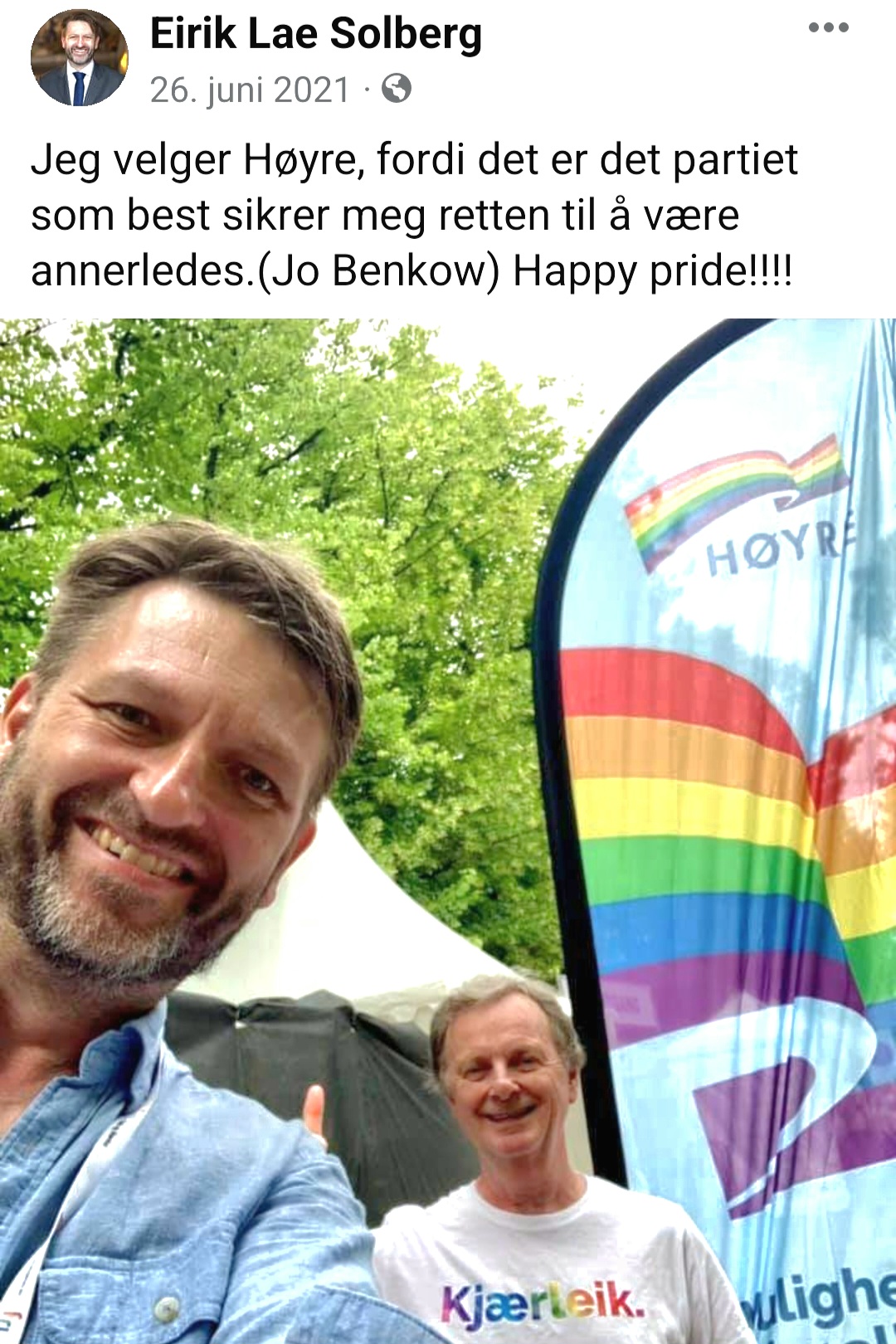 Eirik Lae Solberg er ellers en ivrig Pride-deltaker. Hvor mye Pride tror Lae Solberg det blir hvis islam overtar? Kan noen fortelle ham at det ikke er islamismen, men kristendommen som er homsenes bestevenn? De andre har dødsstraff for homofili.