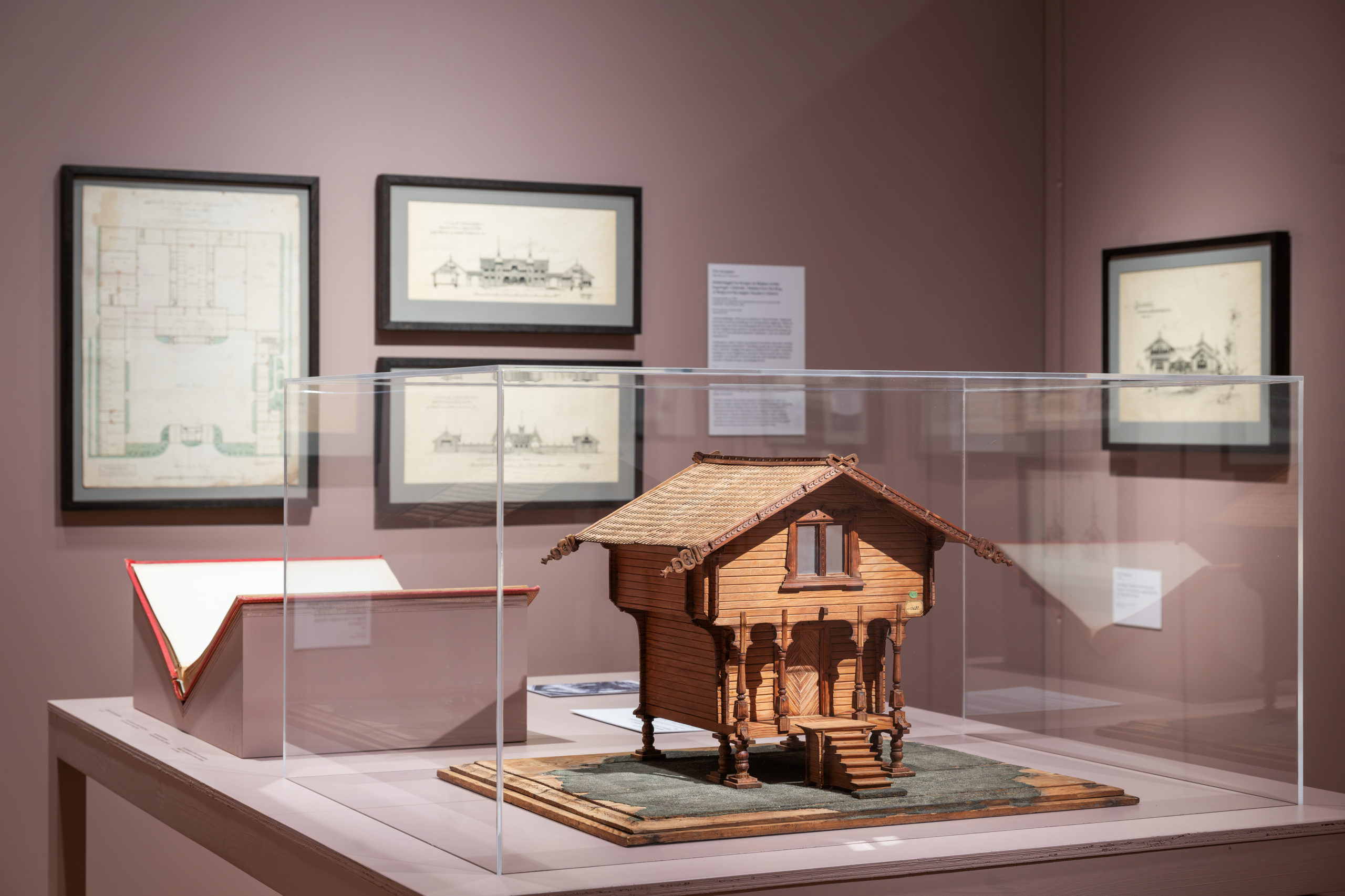 Alt dette blir «utdypende» behandlet i den nevnte katalogen der tre skolerte fagfolk forklarer oss at det vi kaller dragestil i stavkirker og gamle bondehus ikke er noe autentisk og opprinnelig, men en tidsbetinget konstruksjon klekket ut av datidens behov for å skape en norsk nasjonal identitet. Utstillingsmaterialet er uansett mer omfattende med ulike typer bilder som viser stavkirker og andre bygninger. Her er også gamle fotografier og stikk, skisser av mønstre og annen dekor, samt noen få malerier,