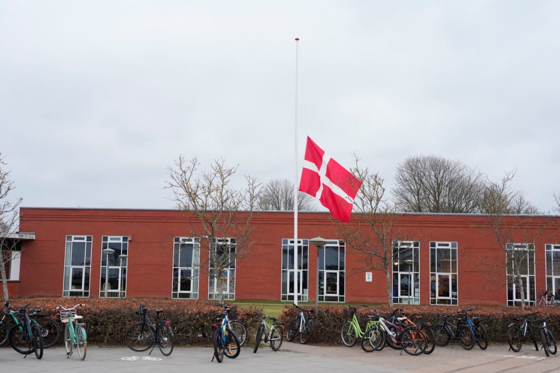 Flagget er på halv stang i sorg på Hjallerup skole i Nordjylland i Danmark, tirsdag 12. mars 2024. Foto: Henning Bagger / Ritzau Scanpix / NTB