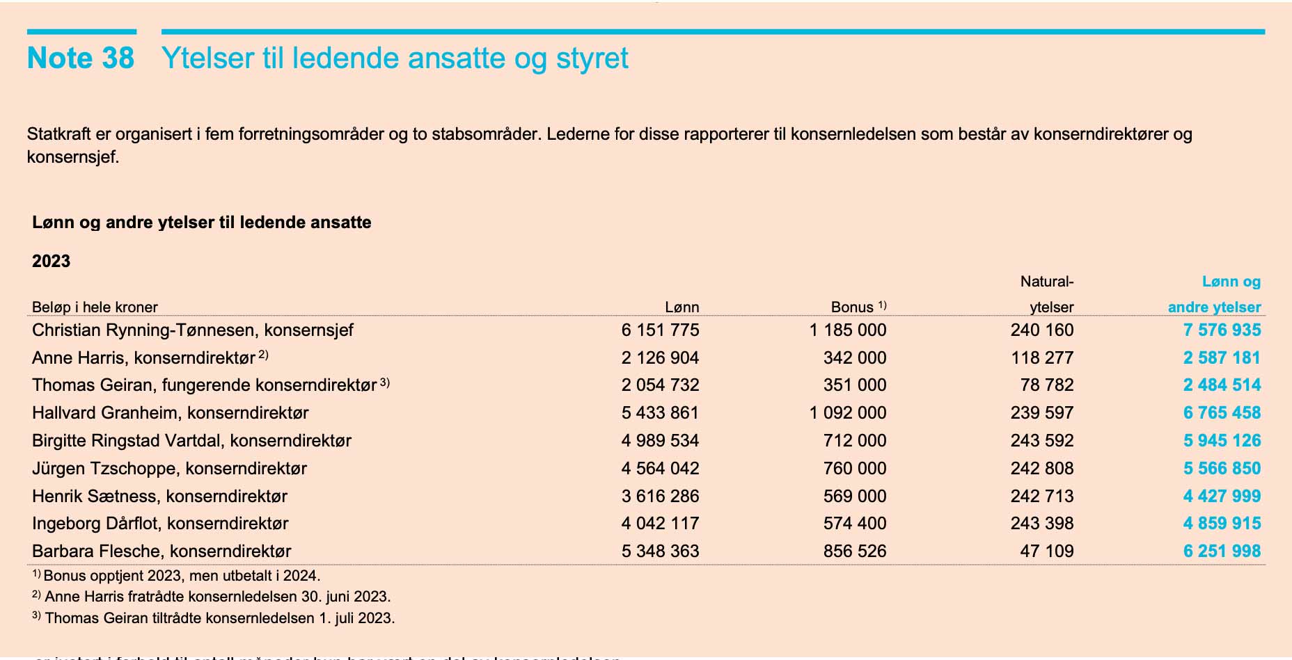 Lederne i de to selskapene lønnes rundhåndet av profitten fellesskapets eiendom kaster av seg. Summene de får avspeiler ikke fallende produktivitet. 7 av 9 Statkraft-ledere hadde for eksempel en årslønn med bonus på over 4 mill. kroner i fjor.
