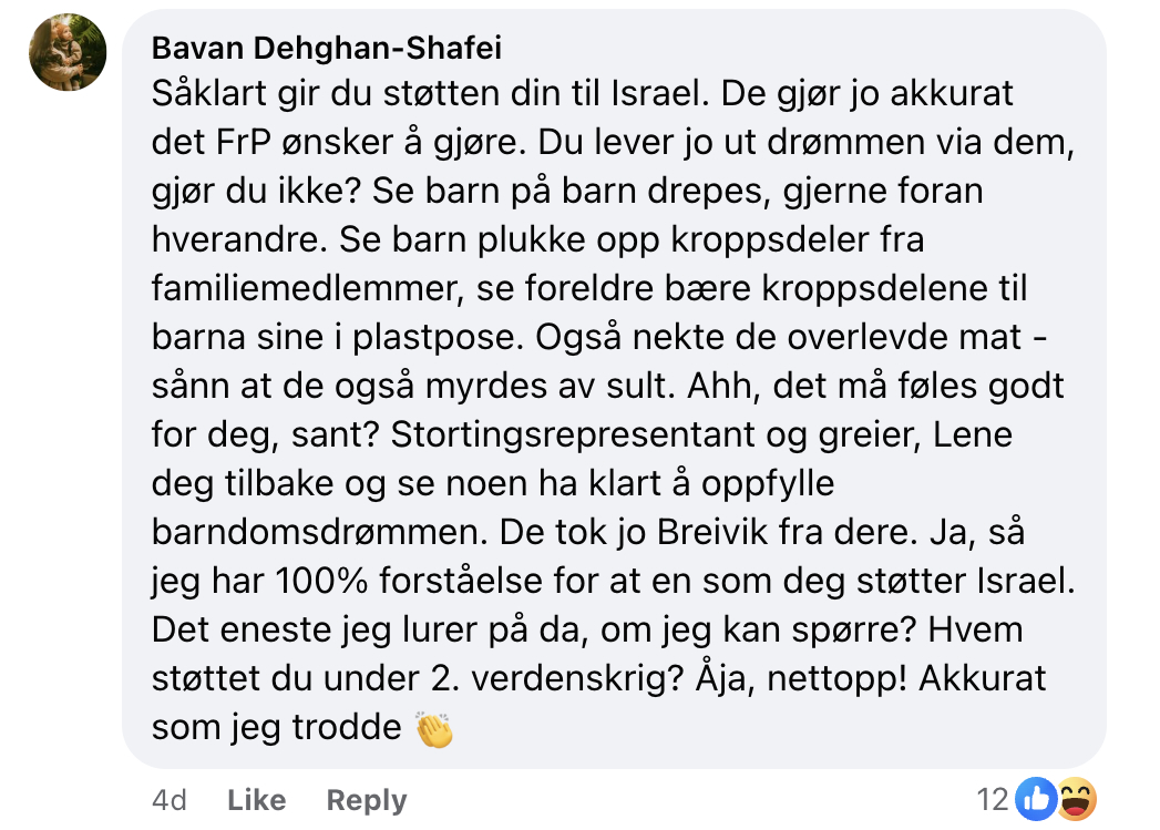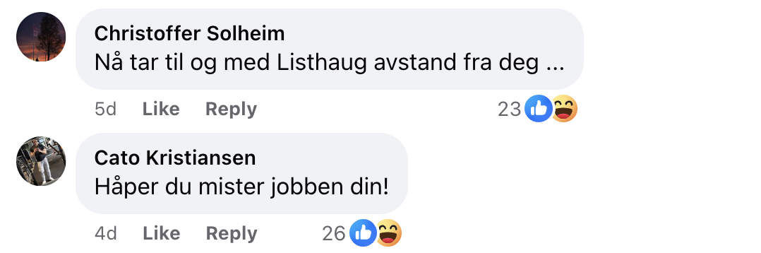 Christoffer Solheim manifesterer skadefryd ved Listhaugs reaksjon, mens Cato Kristiansen håper det går Amundsen ille: