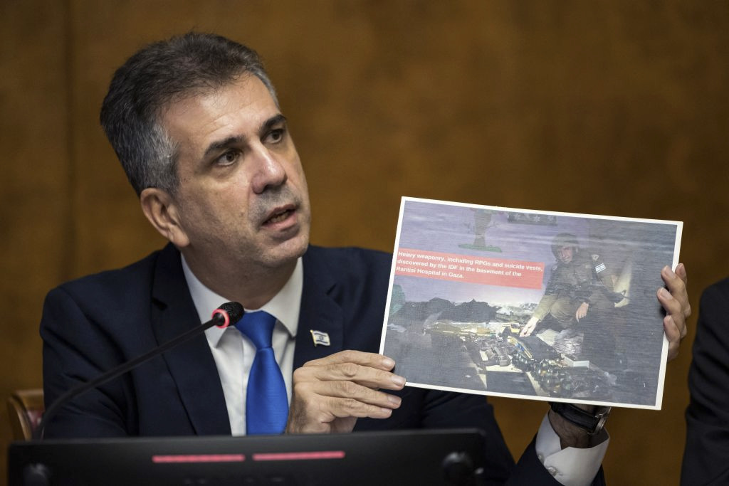Hamas er kanskje det første regimet i historien som har utkjempet en krig designet for å maksimalisere tapene blant sin egen befolkning. Bildet: Israels utenriksminister Eli Cohen viser et bilde av en israelsk soldat som poserer ved siden av et Hamas-våpenlager som ble funnet ved Rantisi-sykehuset i Gaza, på en pressekonferanse ved FNs Europakontor i Genève 14. november 2023. (Foto: Pierre Albouy/AFP via Getty Images)