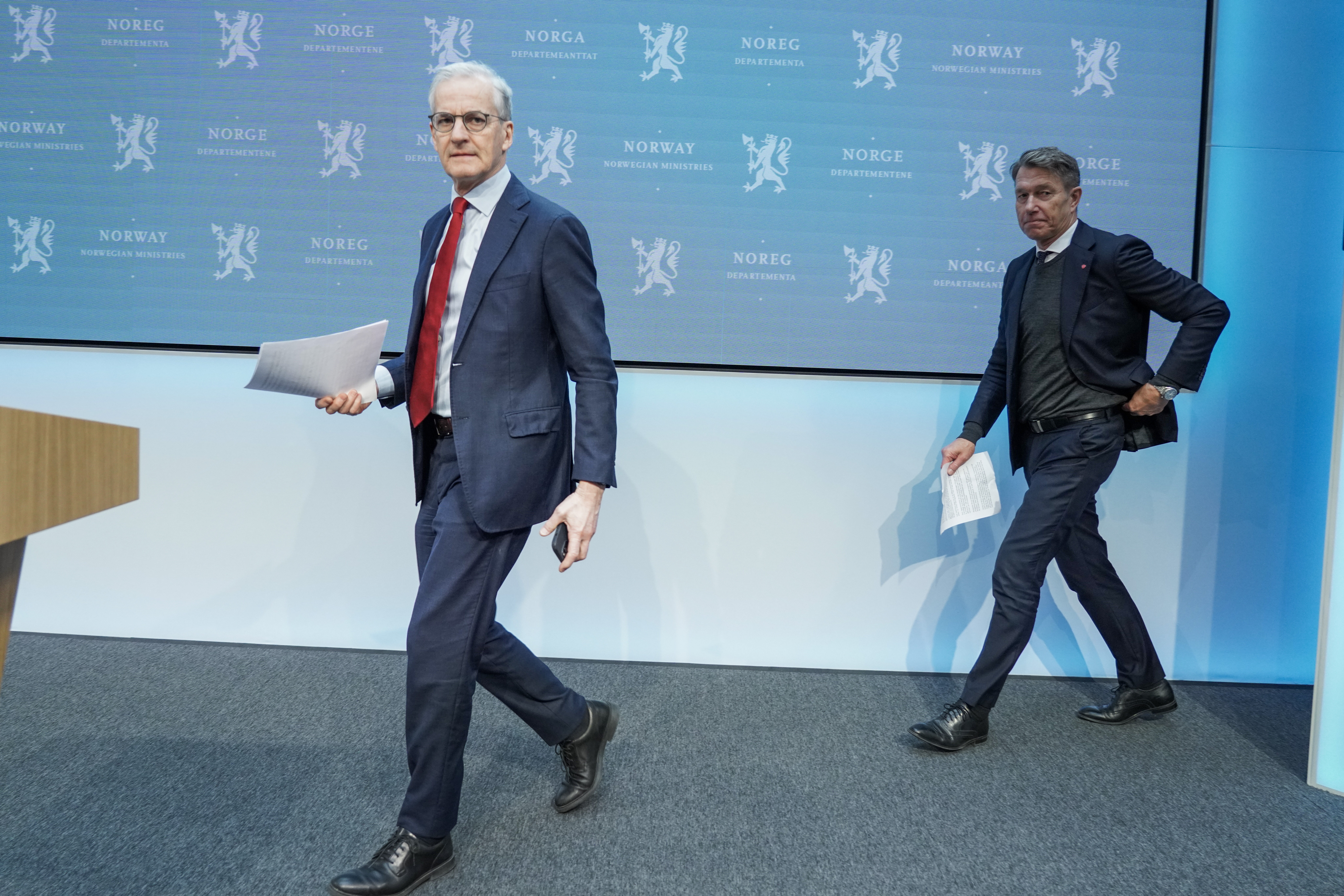 Statsminister Jonas Gahr Støre (Ap) og energiminister Terje Aasland (Ap) under pressekonferansen i forbindelse med havvindauksjonen i Oslo den 20. mars 2024. Foto: Ole Berg-Rusten / NTB.