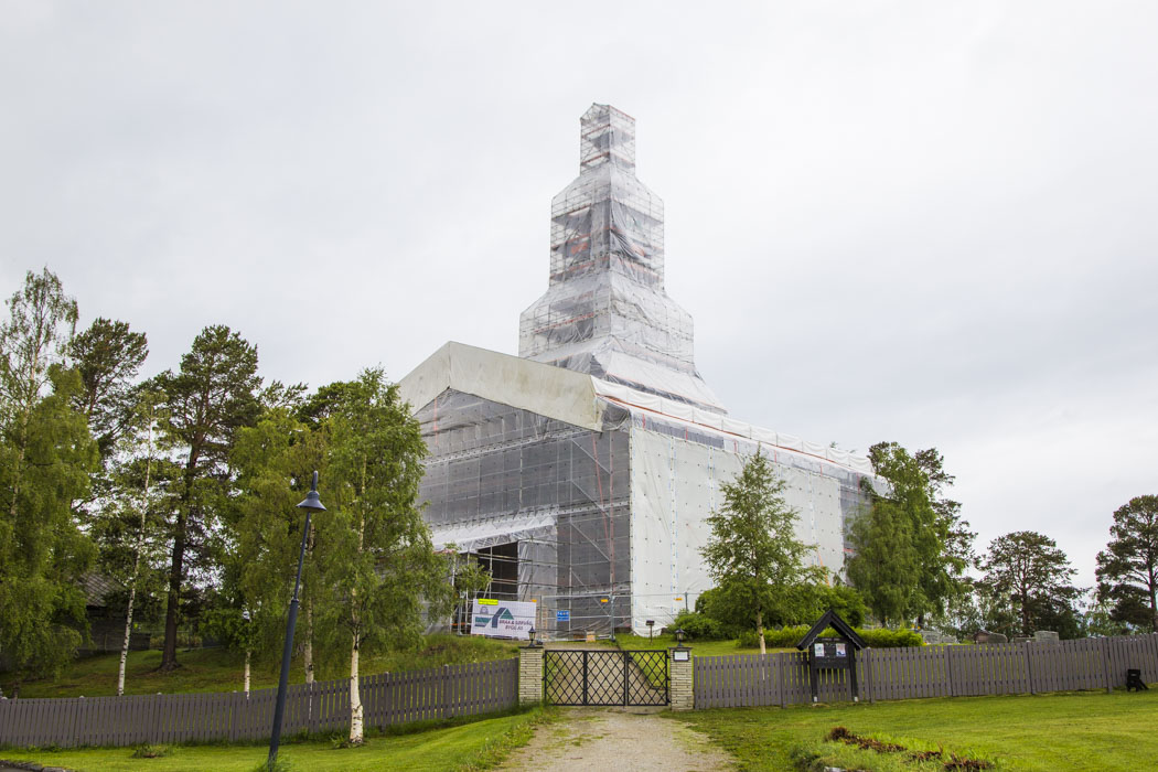 Reparasjon av Dombås kirke i tidlig fase, i september 2020. Kirken ble svært ødelagt da den ble påtent natt til 20. februar 2020 av somaliske «Abdul». Foto: Bente Haarstad.