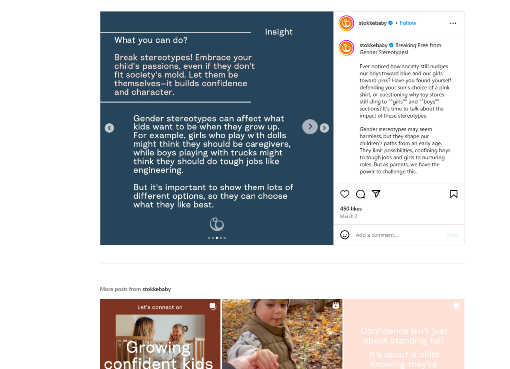 Den 14. mars delte Stokke en kort videosnutt på sin offisielle Instagram-side som viser hvordan en mor bryter kjønnsstereotypier med barnet sitt.