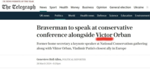 Tidligere innenriksminister Suella Braverman skal opptre sammen med Ungarns statsminister Viktor Orbán på en stor konservativ konferanse neste måned. Dette skaper reaksjoner i britiske aviser.