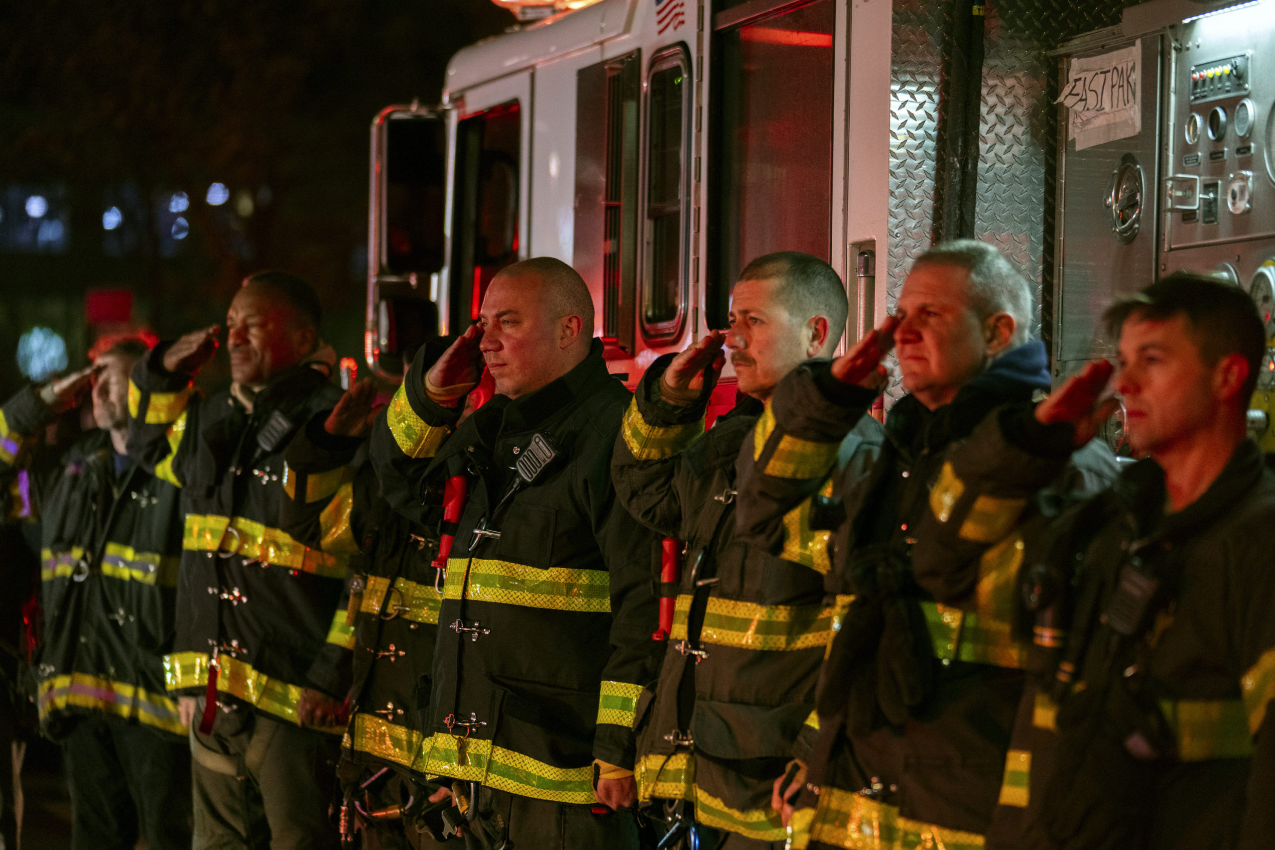 Firefighters salute as the ambulance transporting the body of New York City Police Officer Jonathan Diller exits Jamaica Hospital Medical Center in the Queens borough of New York, Monday, March 25, 2024. Diller was shot and killed Monday during a traffic stop. It marked the first slaying of an NYPD officer in two years. (AP Photo/Jeenah Moon)