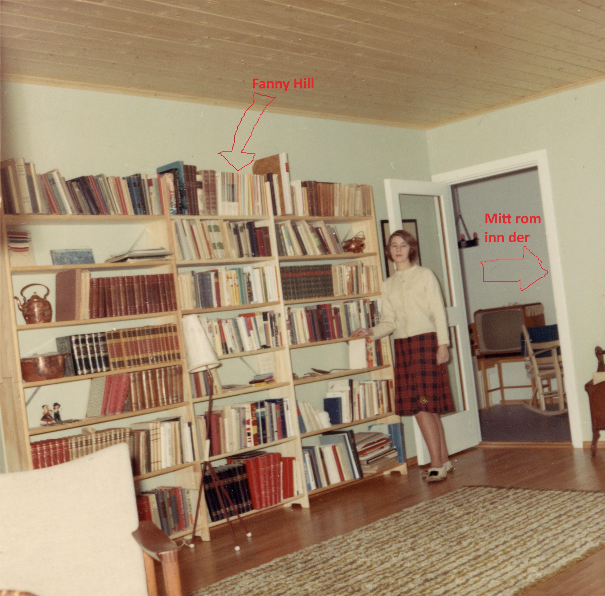 Vårt nye hjem i Kirkeveien i Bærum. Mitt rom inn til høyre i bakgrunnen. «Fanny Hill» skjult bak bøkene i øverste hylle. Min mor Karin, poserer stolt i sin nye bolig. Hun var 35 her, og jeg syntes hun var kjempegammel. Foto: Yan Calmeyer Friis.