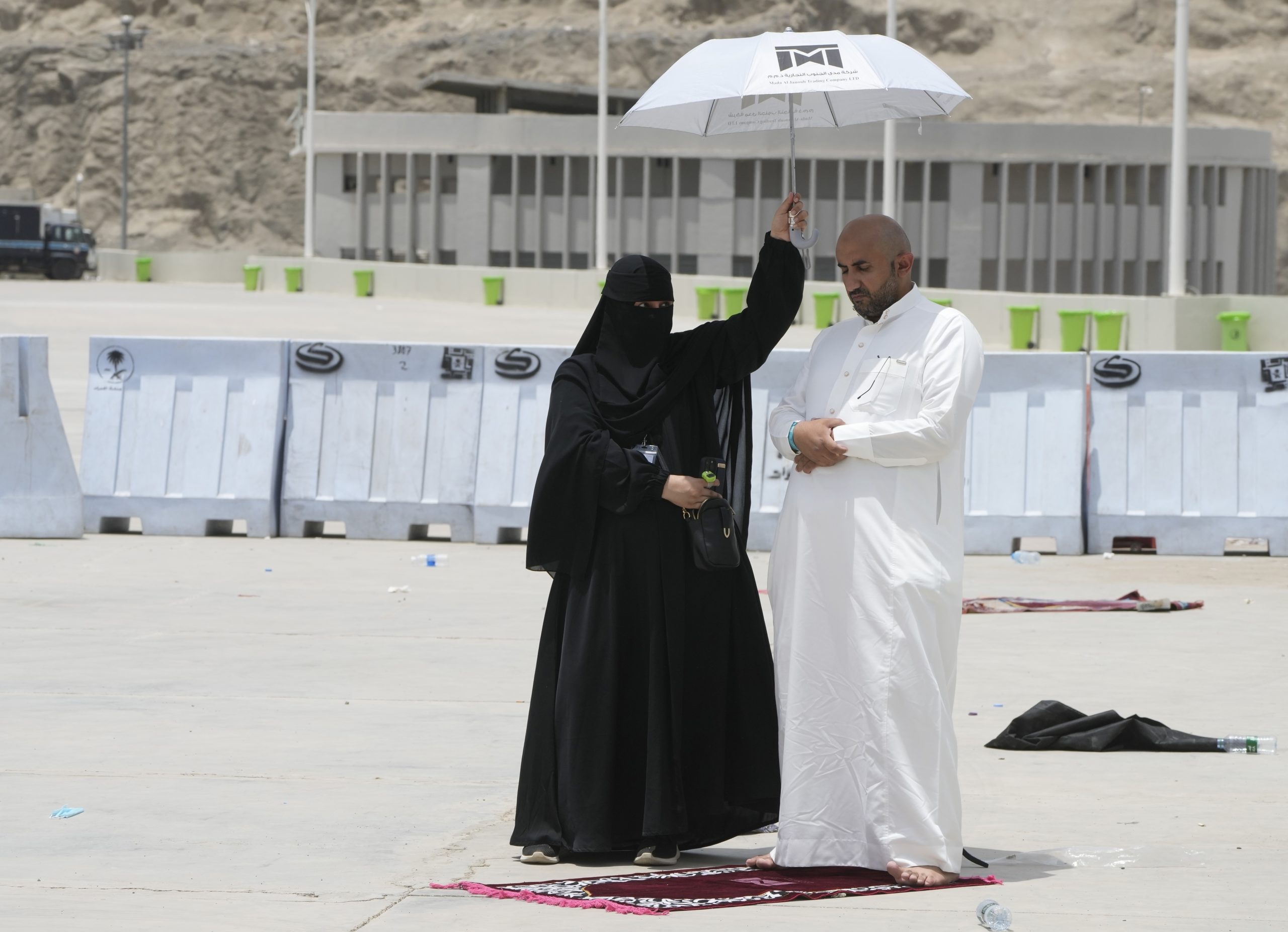 En tildekket kvinne beskytter en mann som ber under hajj i Mekka mot solen den 11. juni 2022. Foto: Amr Nabil / AP / NTB.