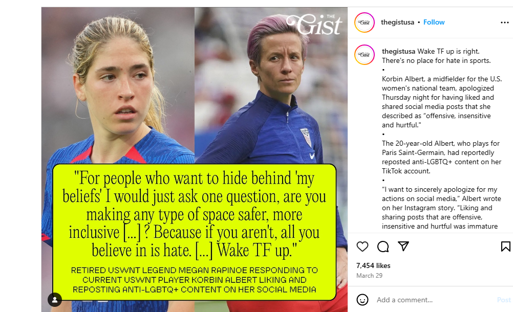 Fiendtligheten mot 20 år gamle Korbin Albert kom etter at hun hadde skapt reaksjoner for å ha likt et innlegg som var «negativt» mot LHBT-samfunnet. Megan Rapinoe ber henne å våkne [the fu*k] opp for barn tar livet av seg på grunn av hennes hat.