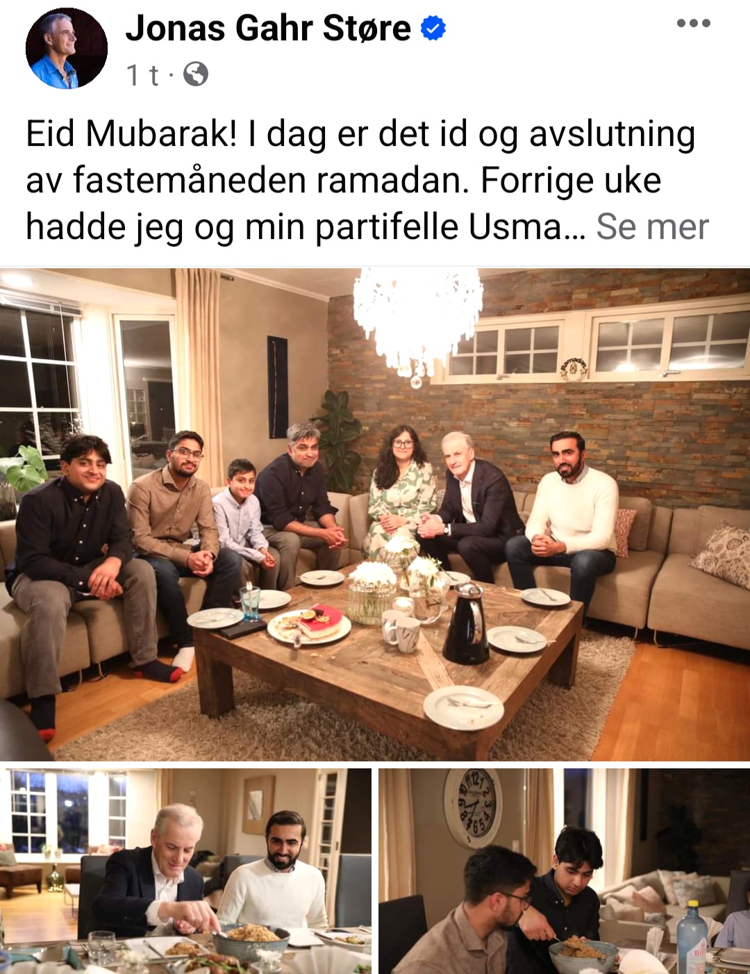 «Eid Mubarak! I dag er det id og avslutning av fastemåneden ramadan. Forrige uke hadde jeg og min partifelle Usman gleden av å spise Iftar-måltid sammen, hjemme hos Arslan og Ashy og deres familie på Strømmen. Det å få oppleve gjestfriheten, den gode maten og de gode samtalene var en flott opplevelse og en del av dagens Norge jeg setter stor pris. Dagen i dag er en viktig dag for muslimer i Norge, og jeg håper alle som markerer dagen får en hyggelig feiring med familie og venner.»