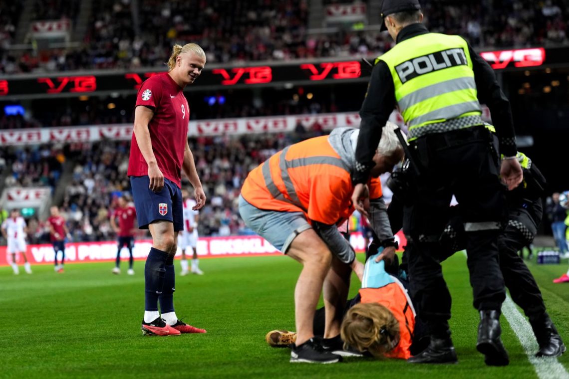Erling Braut Haaland ser politi og sikkerhetsvakter fjerner en demonstrant under EM-kvalifiseringskampen i fotball mellom Norge og Georgia på Ullevaal stadion. Foto: Fredrik Varfjell / NTB