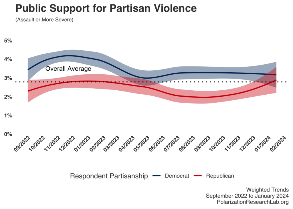 I slutten av 2022 var tallene for Demokratene ca 45 % høyere enn Republikanerne. Demokratenes støtte til politisk vold har siden gått ned, men er fortsatt noen hakk høyere enn Republikanerne.
