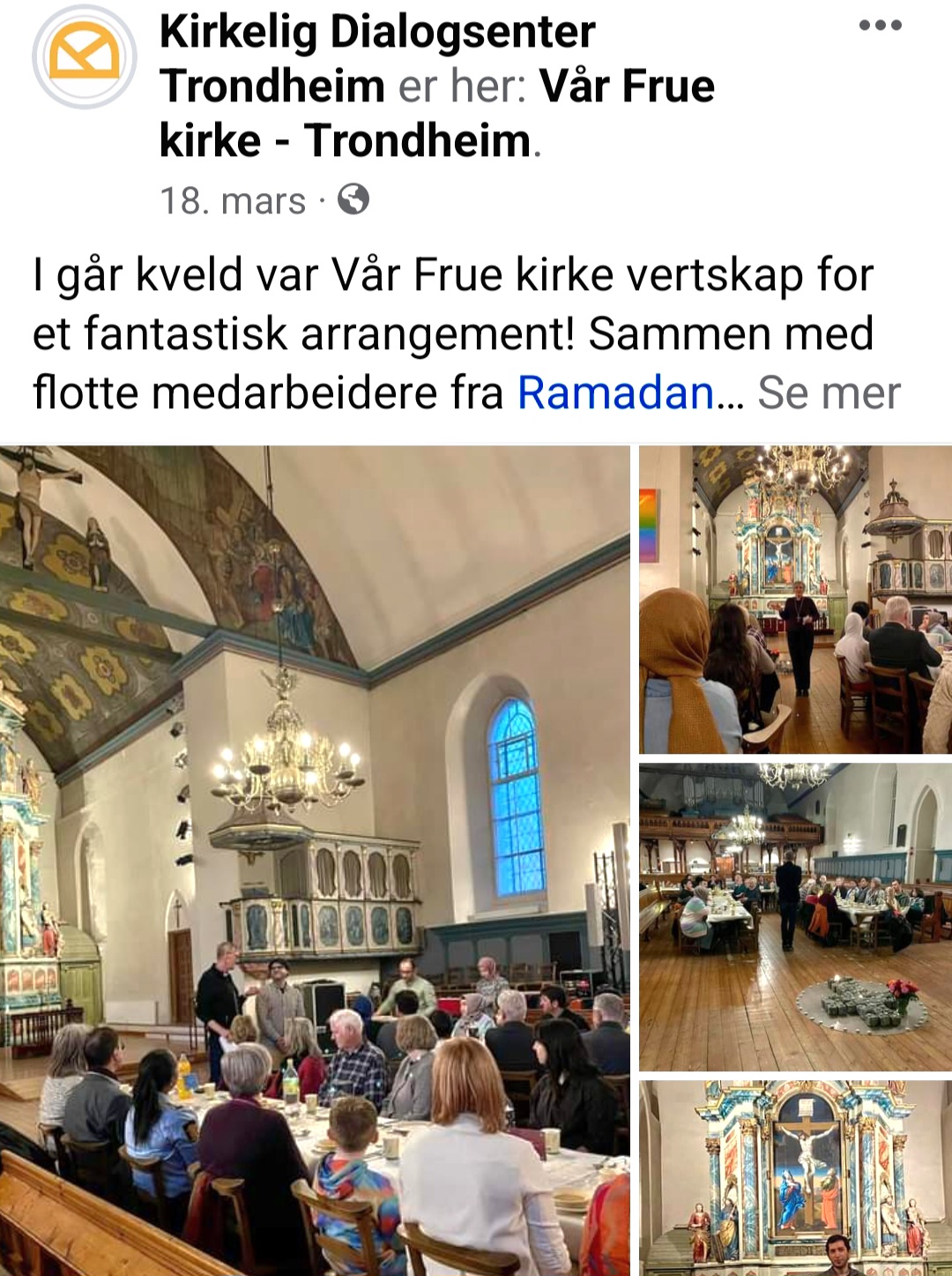 Finnset var for øvrig på islamsk arrangement i en annen av sine middelalderkirker bare for en liten tid tilbake. Da var hun på iftar og ramadan-feiring i Vår Frue kirke i Trondheim. Vi vet ikke om det var bønneutrop der, slik det har vært i andre kirker og menigheter ivrige på iftar og ramadan. Det vil si at det på arabisk ropes at «Allah er størst. Allah er størst. Jeg vitner om at det ikke finnes noen gud utenom Allah.»