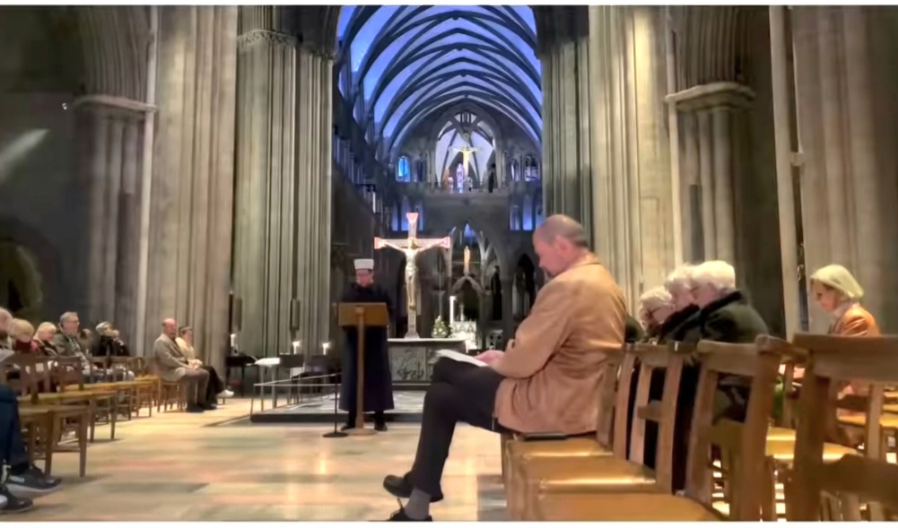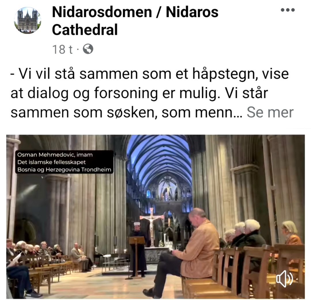 Lyden er noe dårlig, men både Ralph Buchmann, forstander i Det jødiske samfunn i Trondheim, og biskop Herborg Finnset synes å ha snakket om ønsker om fred, mens imamen starter sitt innlegg (etter det arabiske) med å snakke om «Min Herre», altså en direkte henvendelse til Allah. Og det foran hovedalteret i Nidarosdomen. Mens det var mye «meg» i resten av innlegget, i den grad det var hørlig.