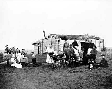Flere familier foran et torvhus som ble bygget i 1884 på gården til Ole I. Gjevre, i Osnabrock Township, Cavalier County, Dakota Territory.