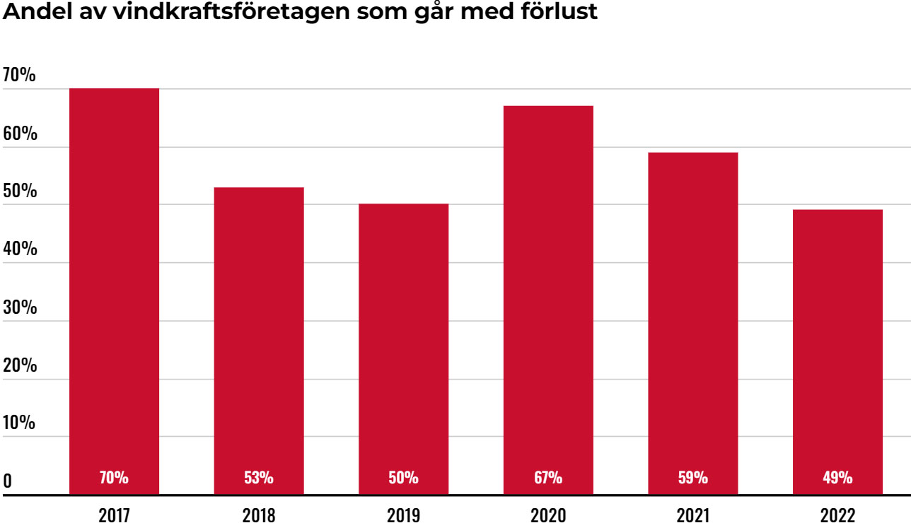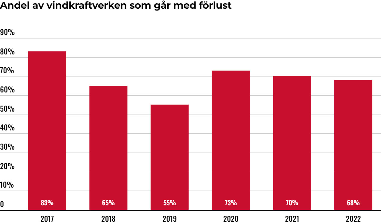 I gjennomsnitt viste 58 prosent av svenske vindkraftselskaper røde tall i perioden 2017–2022. 69 prosent av vindturbinene befant seg i selskaper som tapte penger. Representanter for bransjen beskriver 2022 som et godt år – et år da 49 prosent av selskapene gikk med underskudd mens 68 prosent av vindturbinene tapte penger, skriver Affärsvärlden.