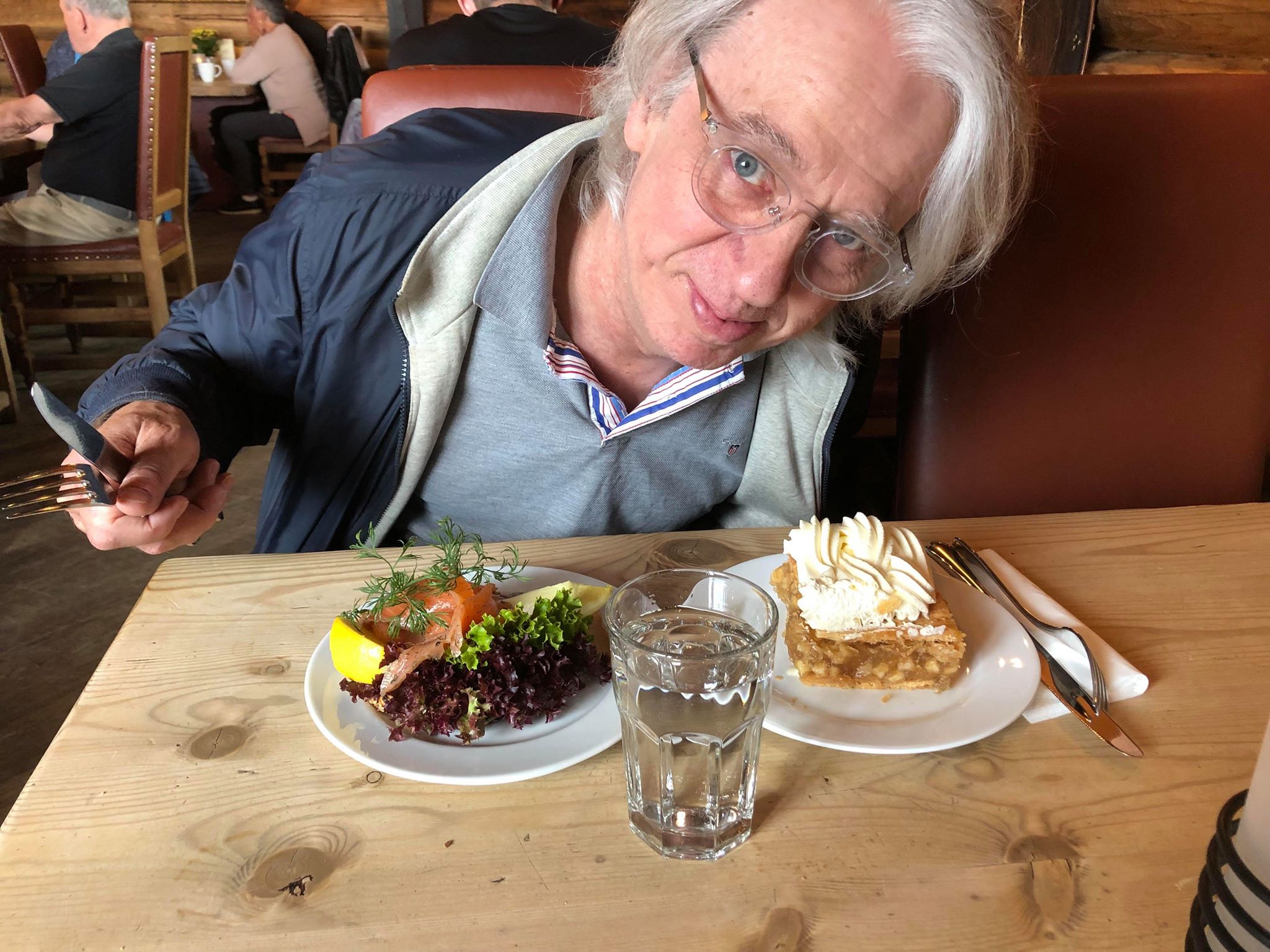 Eplekaken: Artikkelforfatteren i et forsøk på å gjenskape møtet med Slade, her på Frognerseteren i mai 2019. Eplekaken til høyre, grønnsaker til venstre. Foto: Lin Li