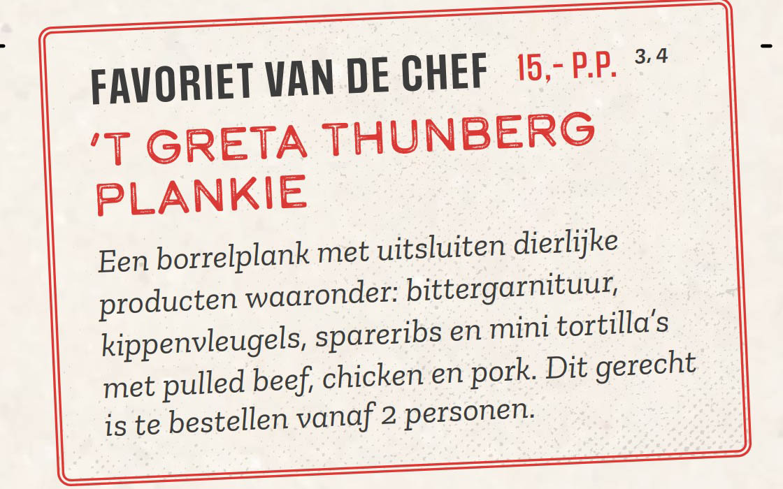 Restauranten Boszicht i Echten 14 mil øst for Amsterdam, introduserte nylig en ny rett: «Greta Thunberg-tallerken» består utelukkende av kjøttretter som kylling og svin. Efter introduksjonen fikk restauranten en bølge av negative anmeldelser på sosiale medier.