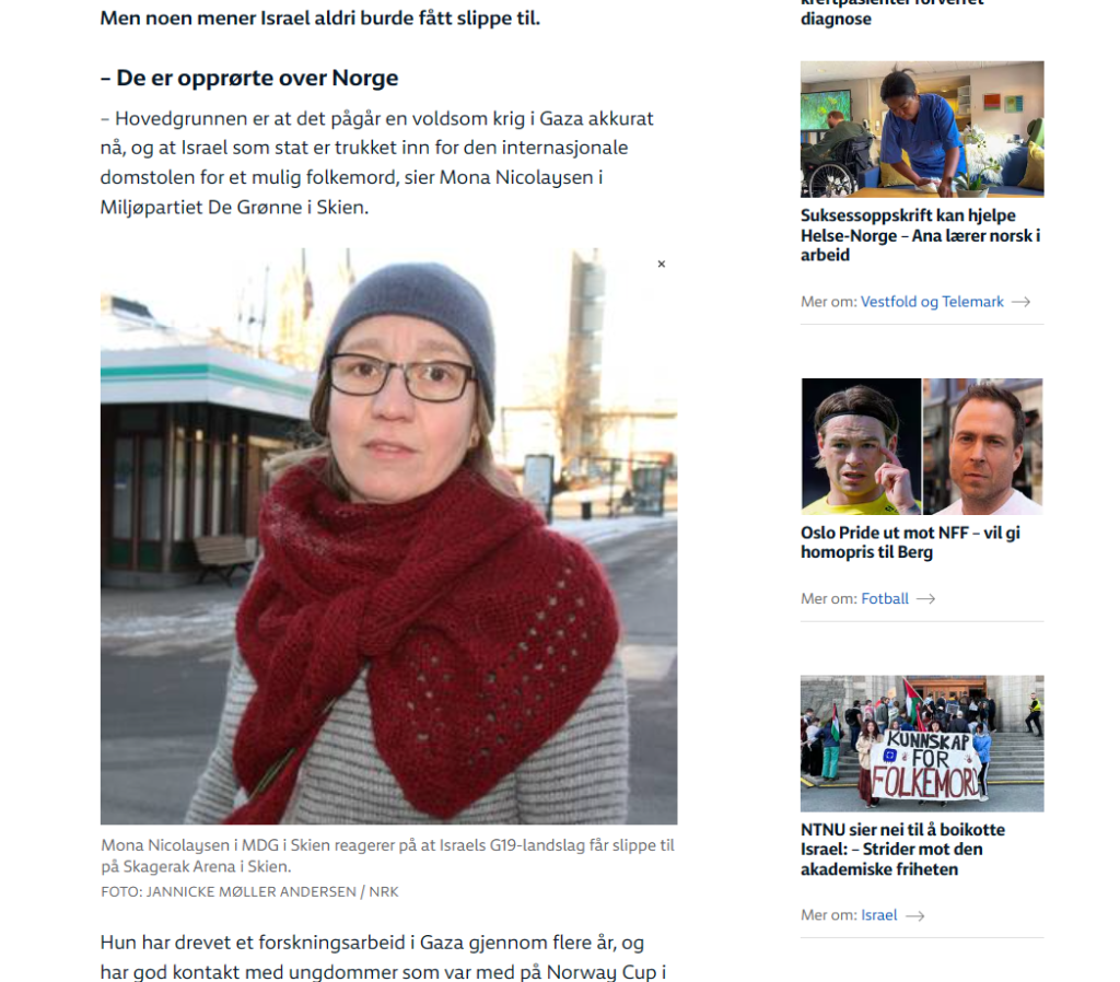 Mona Nicolaysen i Miljøpartiet De Grønne i Skien mente derimot at Israel aldri burde fått slippe til. Aktivisten har drevet et forskningsarbeid i Gaza gjennom flere år, og har god kontakt med ungdommer der som var med på Norway Cup i 2021.