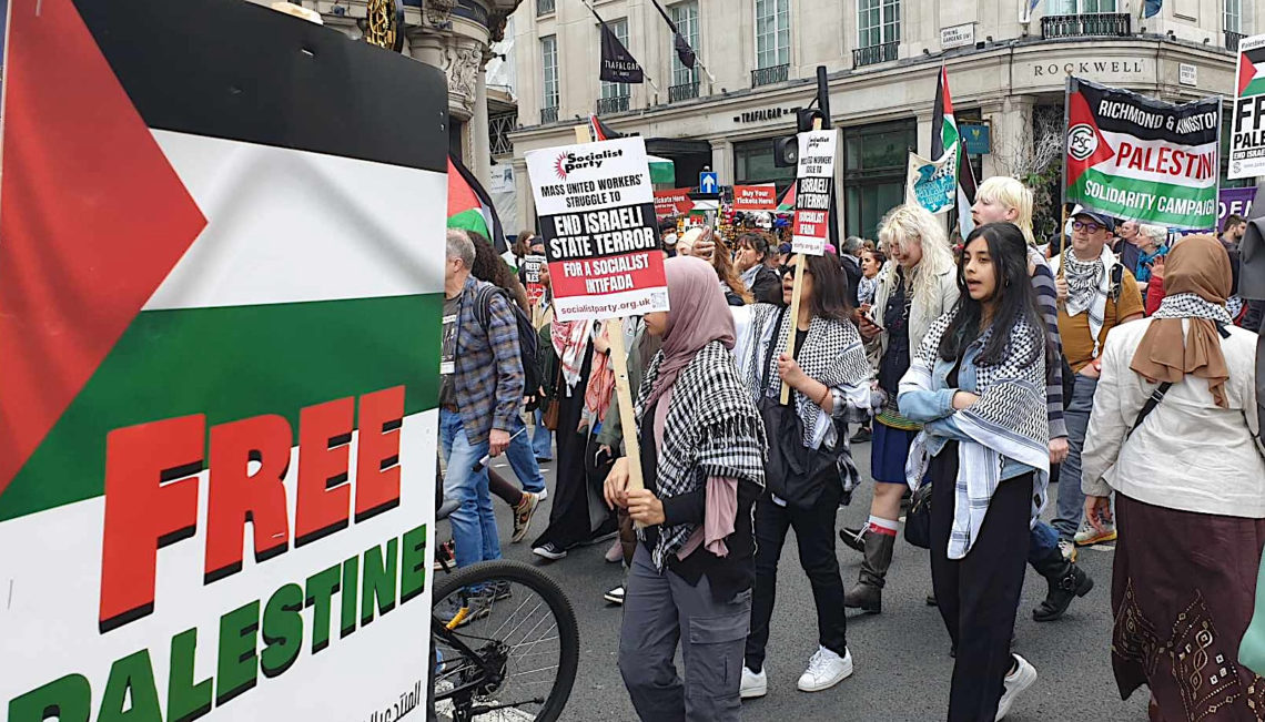 De pro-palestinske demonstrasjonene i London pågår fremdeles hver lørdag, og den 18. mai er ikke noe unntak. Parolen «For a socialist intifada» fanger vår tid på en svært konsis måte: Både ytre venstre og islam ønsker å erstatte det vi hadde, med kaos. Hvorfor måtte slutten på Vesten inntreffe i vår levetid? Foto: Hanne Tolg.