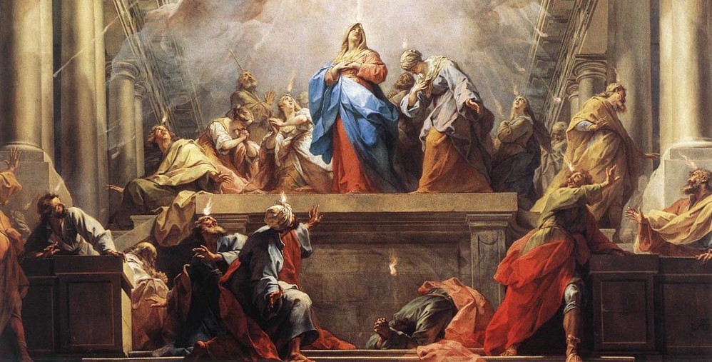 När sedan pingstdagen var inne, voro de alla församlade med varandra. Då kom plötsligt från himmelen ett dån, såsom om en våldsam storm hade dragit fram; och det uppfyllde hela huset där de sutto. Och tungor såsom av eld visade sig för dem och fördelade sig och satte sig på dem, en på var av dem. Och de blevo alla uppfyllda av helig ande och begynte tala andra tungomål, efter som Anden ingav dem att tala.