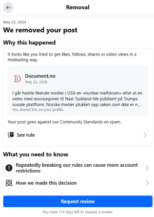 Facebook slettet saken om norske medier som sprer løgner om Trump-video og Hitler, og beskyldte Document for å spre villedende informasjon bare for å få likes, følgere og delinger.