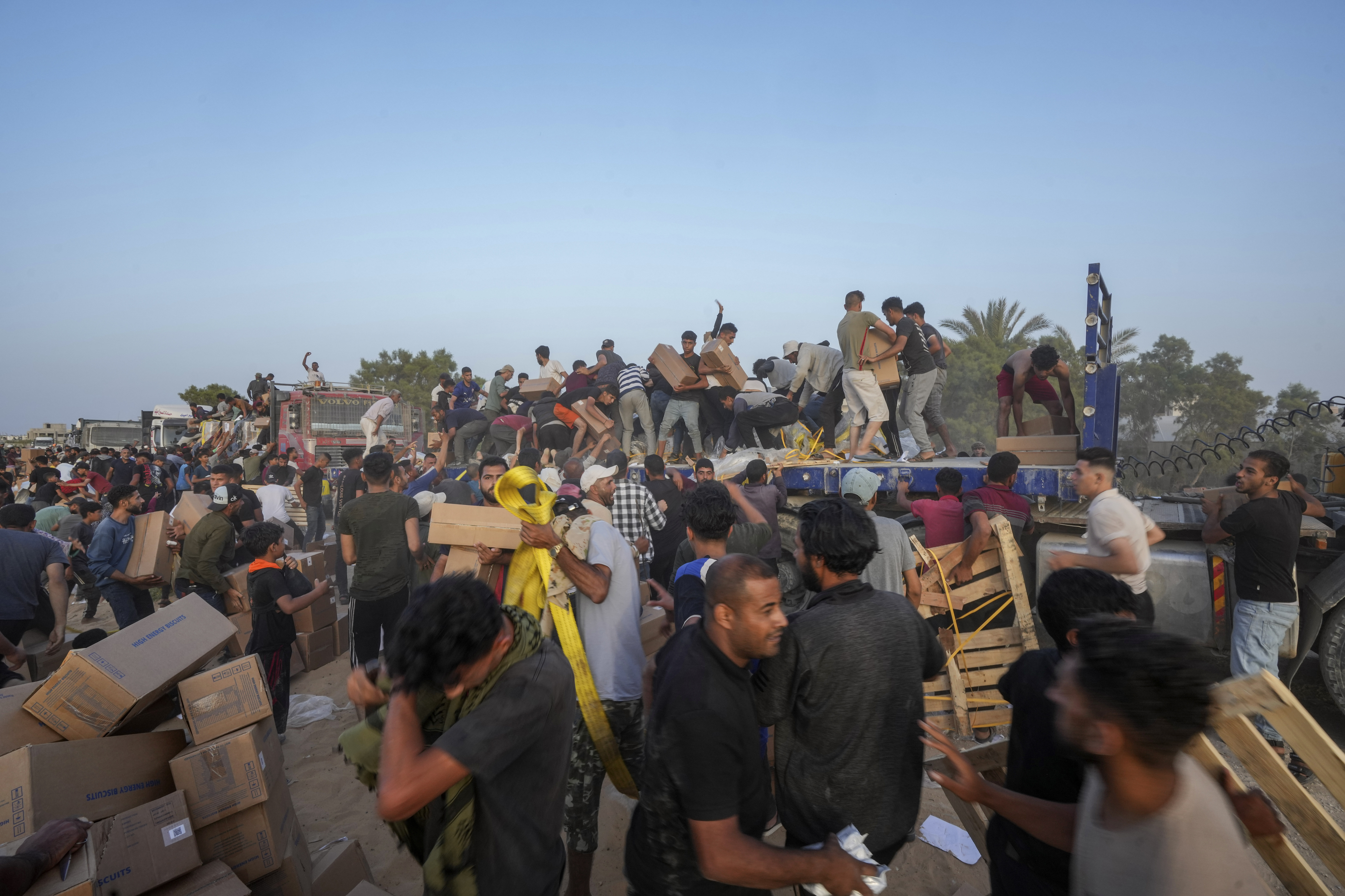 Palestinere stormer lastebiler lastet med humanitær hjelp som er brakt inn gjennom en ny USA-bygget pir på den sentrale Gaza-stripen lørdag 18. mai 2024. Foto: Abdel Kareem Hana / AP / NTB.