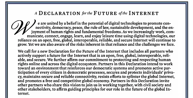 Spol ti år frem i tid fra da frihetserklæringen ble skrevet. Året er 2022, og vi har vært gjennom to tøffe år med kontonedleggelser, særlig mot dem som tvilte på klokskapen i nedstengninger eller vaksinepåbud. Det hvite hus offentliggjorde 22. april 2022 en erklæring for fremtidens internett. Den kommer komplett med en pergamentlignende presentasjon og en stor forbokstav i gammeldags skrift. Ordet «frihet» er fjernet fra tittelen og bare lagt til som en del av ordsalaten som følger i teksten.