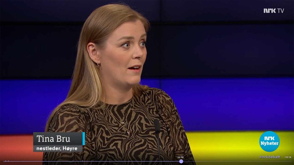 Høyres nestleder Tina Bru beklager seg over at NRK Debatten lot henne møte to økonomer som var uenige med henne og mener programmet er «rigget for å vise at politikere er ganske dumme».