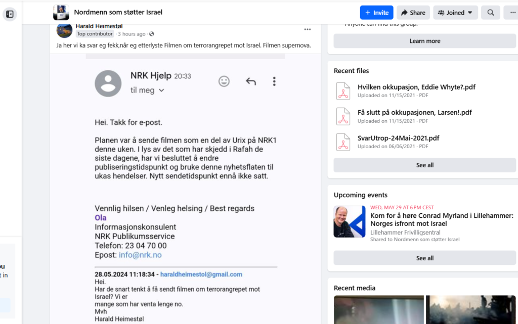 Harald Heimestøl er medlem av gruppen Nordmenn som støtter Israel, og publiserte et innlegg i dag som viser korrespondanse mellom ham og NRK
