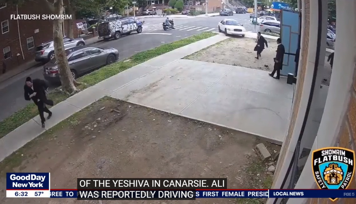 Videoopptak tatt av Flatbush Shomrim Safety Patrol viser den gale sjåføren som gir gass og kjører mot fortauet der ortodokse jøder står utenfor en yeshiva – en ortodoks jødisk skole for studier av Talmud.
