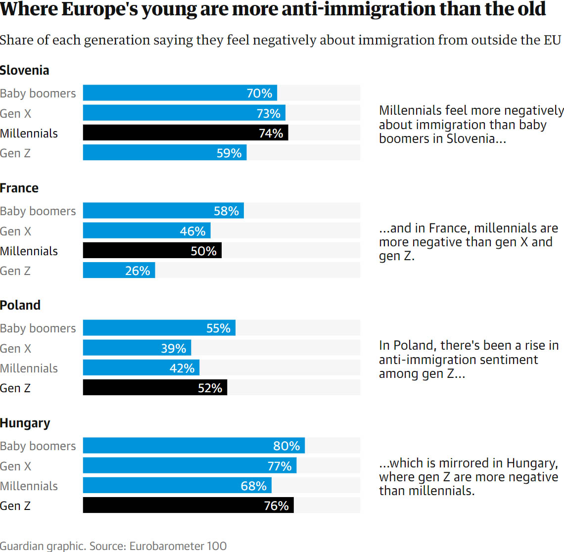 I Europa er babyboomerne (født 1946–1964) fortsatt mest tilbøyelig til å ha innvandringsfiendtlige holdninger, men i enkelte land er millenniumsgenerasjonen – de som er født mellom 1980 og 1997, og generasjon Z, de som er født efter 1997 – like eller mer negativ til innvandring fra land utenfor EU.