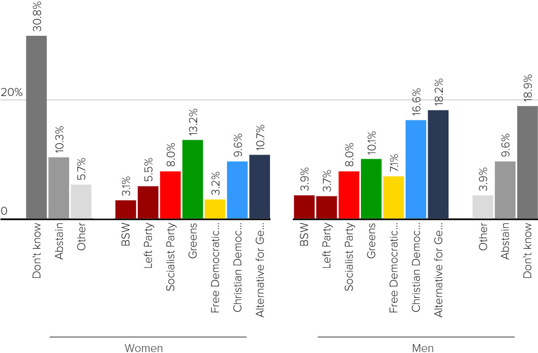 I Tyskland får Alternative for Deutschland 14,5 prosent oppslutning i gruppen 14–29 år. Bare vet ikke-gruppen er større. I 2022 var det De grønne som var størst blant de unge – spesielt gjelder det kvinner.