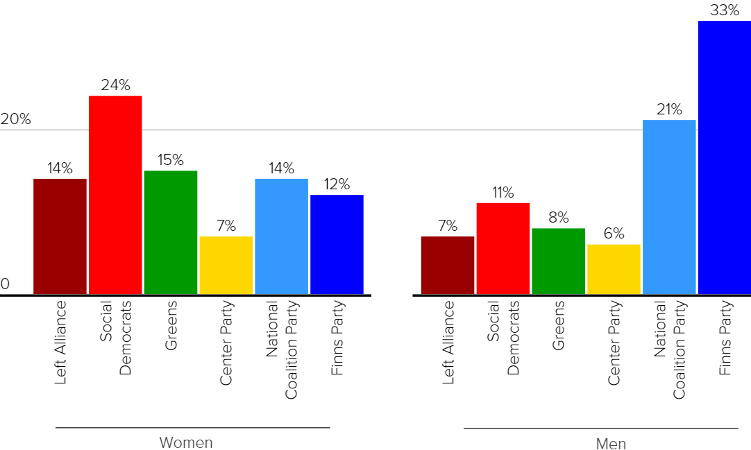 I Finland ble det innvandringsskeptiske høyrepartiet Sannfinnene nummer to med tyve prosent av stemmene i riksdagsvalget 2023. Sannfinnene (Finns Party) var en favoritt i alle aldersgrupper foruten de eldste, og lå milevis foran andre partier blant yngre menn.