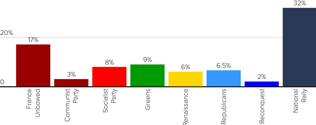 I Frankrike får høyrepartiet Rassemblement National som er ledet av det 28 år gamle stjerneskuddet Jordan Bardella, stor oppslutning fra unge mennesker av begge kjønn. I april sa 32 prosent av 18–25-åringene at de ville stemt på Rassemblement national (National Rally) hvis det var valg påfølgende helg.