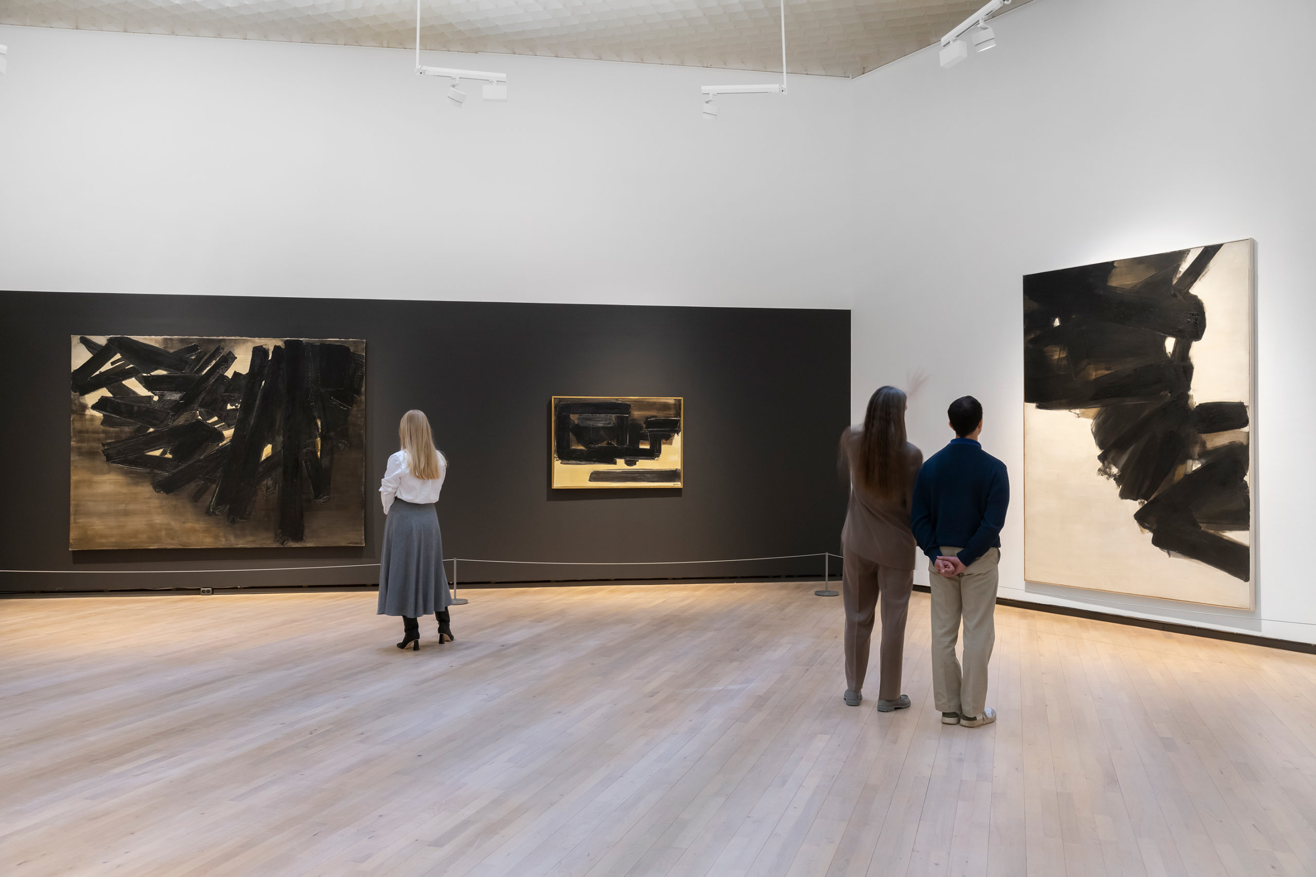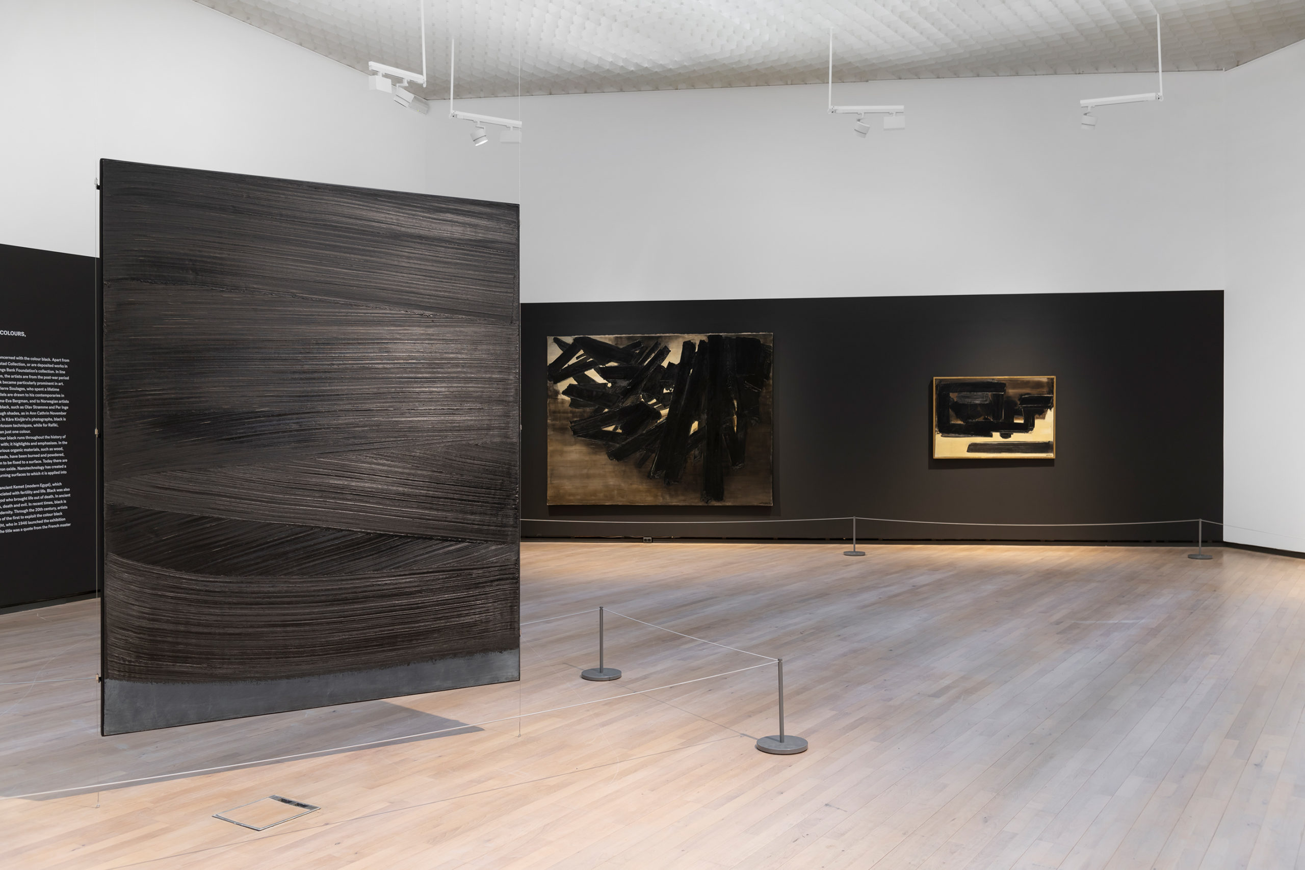 Pierre Soulages, Maleri 16.10. 1983 (1983), Maleri, 22. mars, 59 (1959) og Maleri, 8. august, 58 (1958). Henie Onstad-samlingen. Foto: Øystein Thorvaldsen / Henie Onstad Kunstsenter.