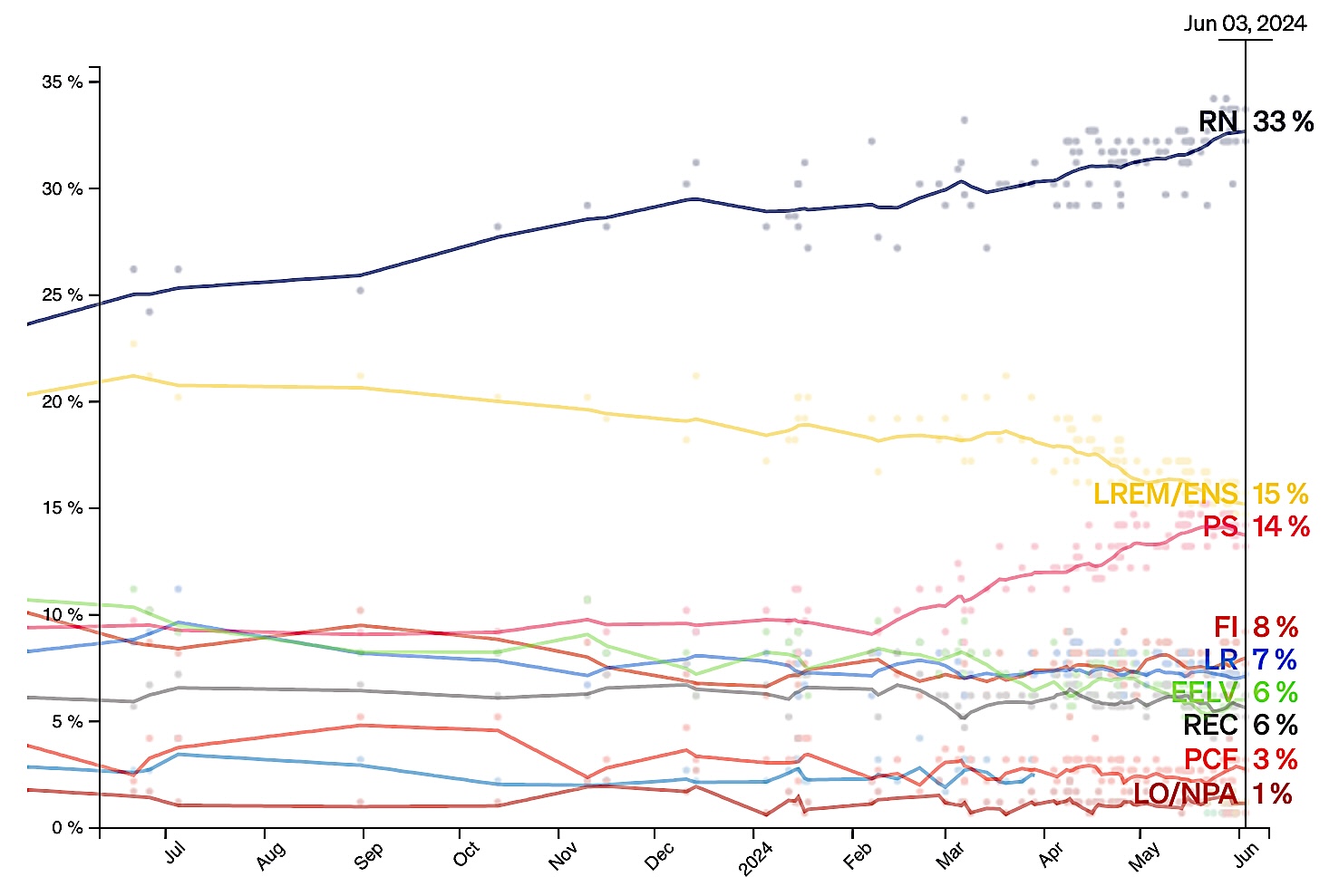 Spørsmålet er om ikke partiet hans snarere risikerer at RN tar makten. Partiet til Marine Le Pen – som er parlamentarisk leder og forventes å stille som presidentkandidat igjen i 2027 – har hatt en jevn fremgang på meningsmålingene det siste året, og håper naturligvis at det kan surfe på medgangsbølgen.