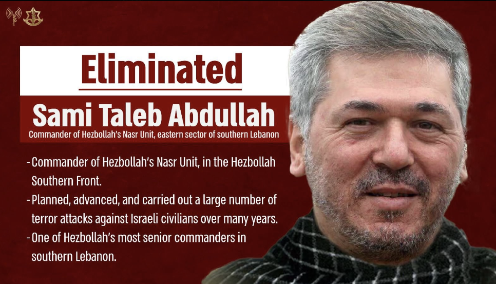 IAF aircraft eliminated Sami Taleb Abdullah, the commander of the Nasr Unit in the Hezbollah terrorist organization, last night. This was part of a strike on a Hezbollah command and control center in the area of Jouaiyya in southern Lebanon, which was used to direct terrorist… pic.twitter.com/DE4qKnC7Mk