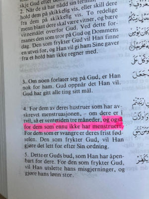 Istedenfor å forby ekteskap med prepubertale jentebarn så legitimiserer Muhammed med dette verset ekteskap med prepubertale jentebarn og dermed legger forholdene til rette for aksept av pedofili i islam. Dette gir også sterke indikasjoner på at han selv var en pedofil.