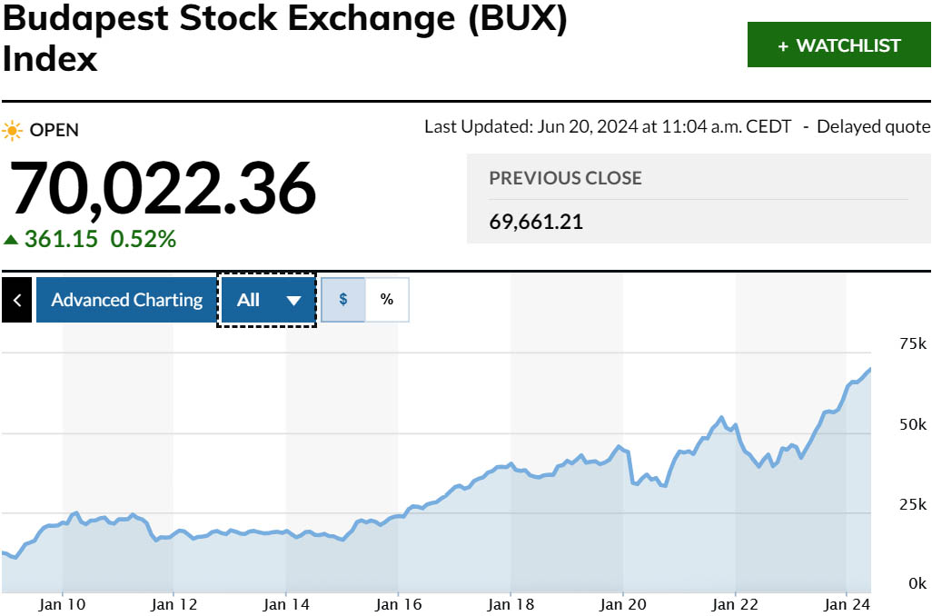 Børsen i Budapest gjør det bedre enn sine regionale rivaler til tross for EUs finansielle kamp mot landet. Nu i juni passerte den 70.000 – «all times high» – for første gang i historien.