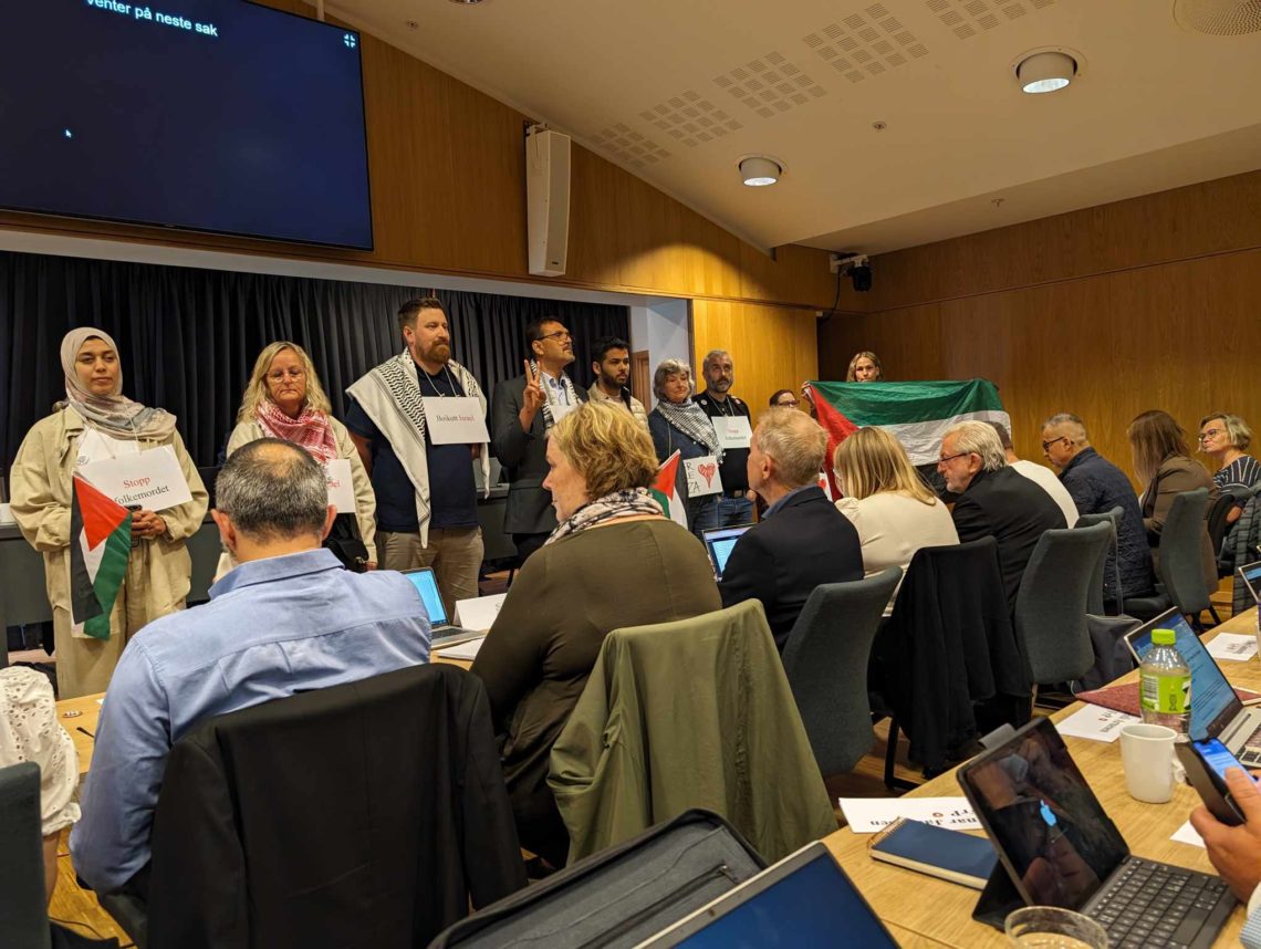 Dette dårlige debattklimaet toppet seg da palestina-aktivister okkuperte bystyremøtet 13. juni. Ordfører Robert Cornels Nordli og varaordfører Inger Brokka de Ruiter gjorde ingenting noe for å forhindre maktovergrepet. De begrunner sin unnfallenhet med at «det ville blitt bråk» om de ikke tillot demonstrantene å være til stede i bystyresalen under bystyremøtet.
