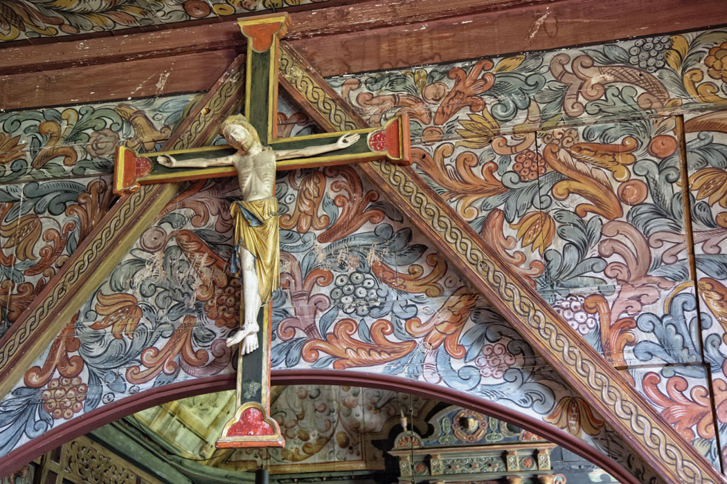 Røldal stavkirke i Hardanger er kjent for krusifikset over korbuen. Det ble sagt å ha helbredende krefter, og trakk mange til kirken. I dag er krusifikset i Røldal den eneste overlevende kultgjenstanden i Norges gamle pilegrimskirker. Kirken er fra 1200-tallet, i likhet med krusifikset. Stavkirken var et av de viktigaste pilegrimsmålene i middelalderen og helt fram til 1835. Foto: Bente Haarstad
