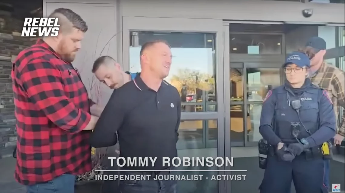 Tommy Robinson er på en turne i Canada i regi av RebelNews. Etter at han hadde holdt et foredrag i Calgary sto ti politifolk klare utenfor og førte ham bort i håndjern. Robinson ble senere løslatt, men passet hans ble konfiskert og han får ikke forlate Canada.