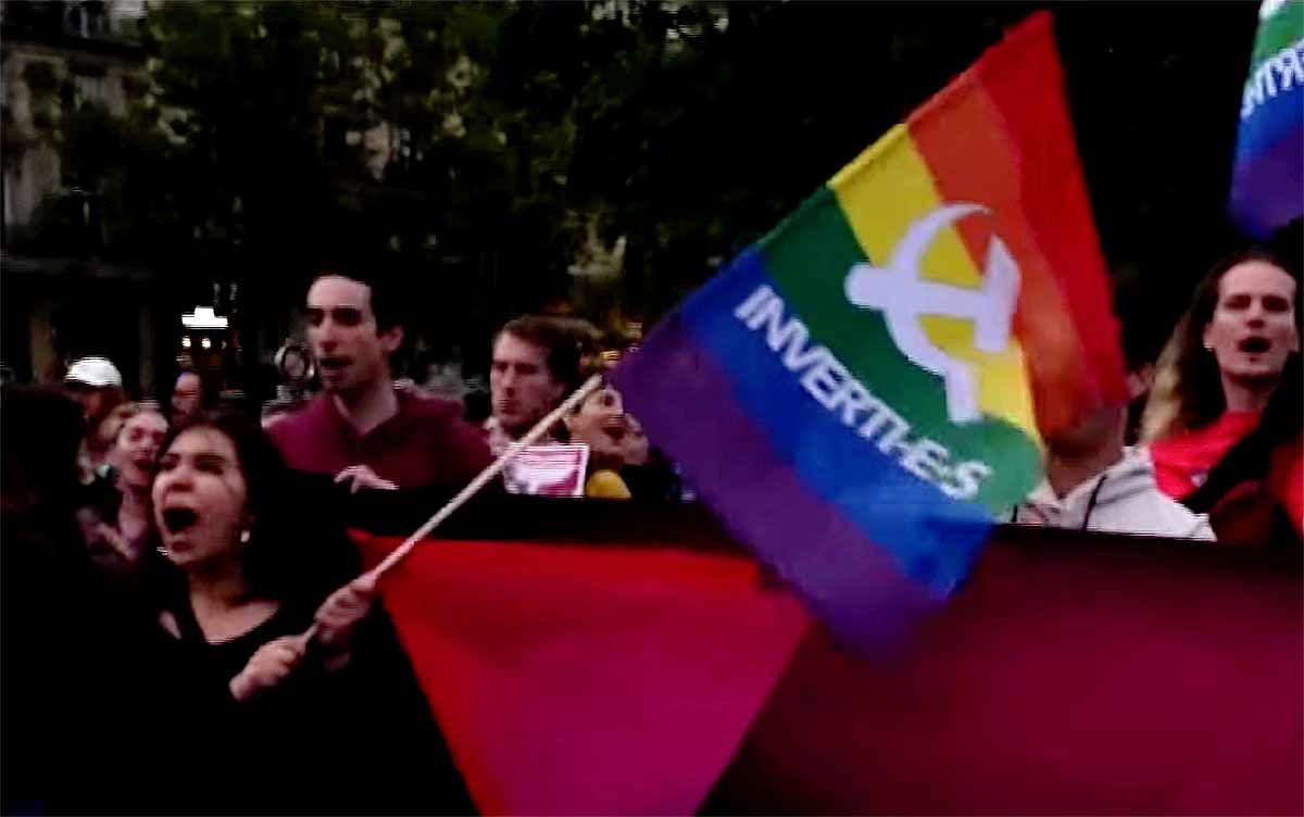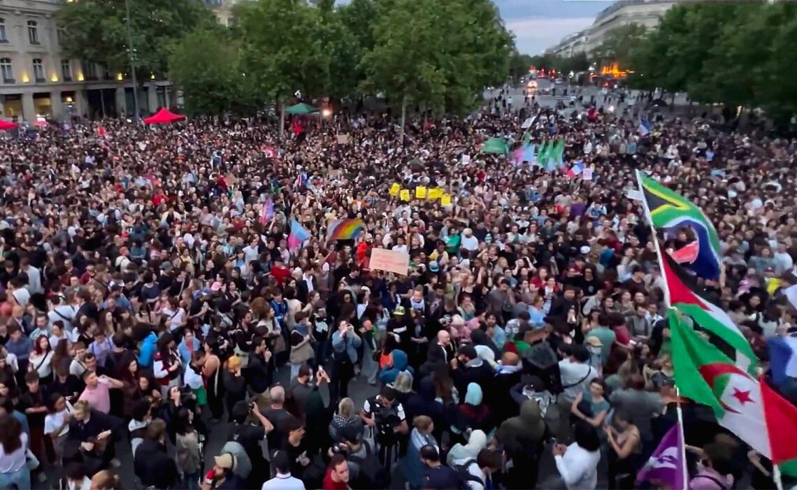 Sør-afrikanske, algeriske og palestinske flagg vaiet høyt over gårsdagens demonstrasjon fra venstrekoalisjonen Nouveau Front Populaire i Paris, etter nederlaget i første valgomgang.