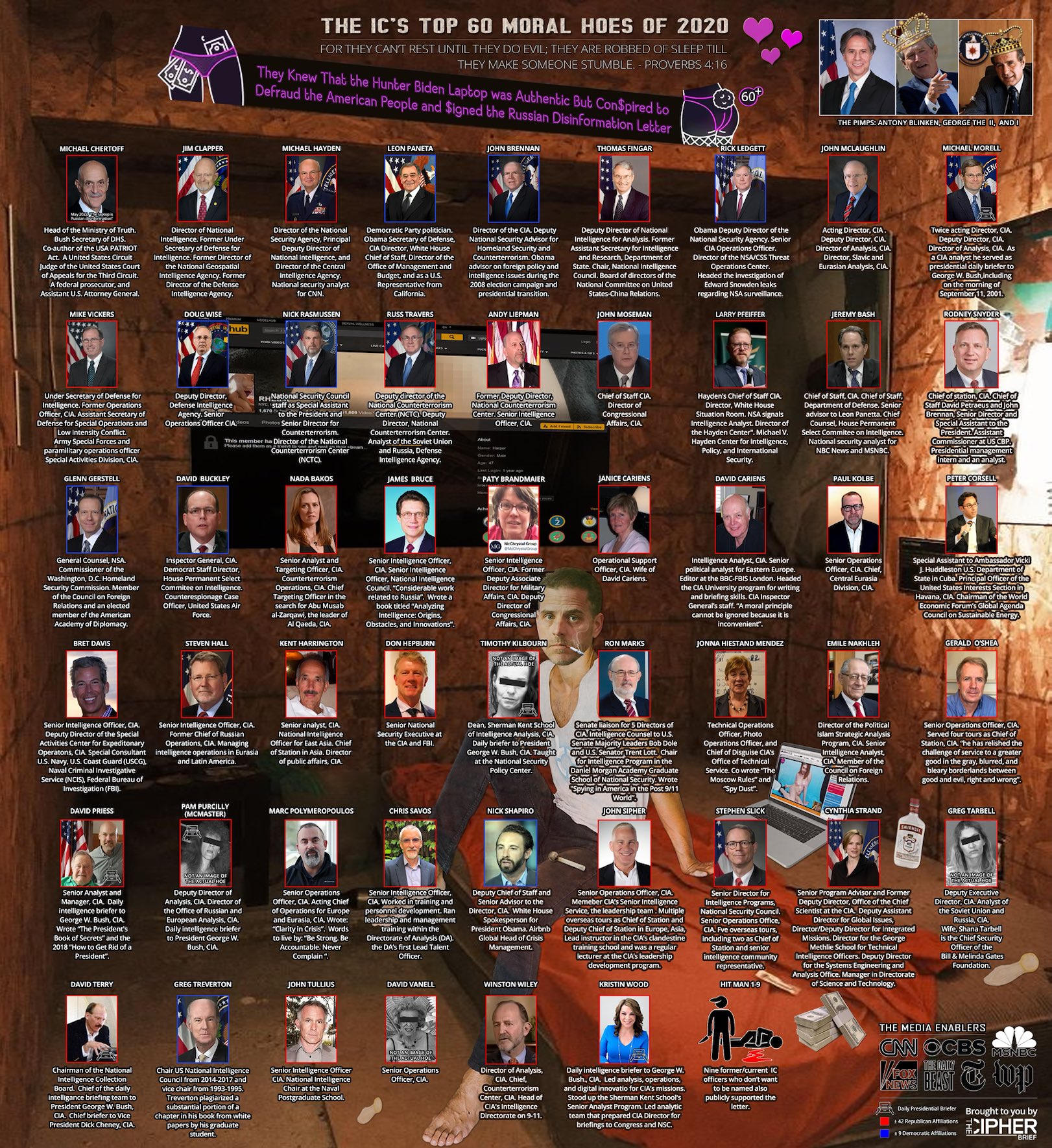 Utenriksminister Tony Blinken organiserte brevet som stemplet Hunters laptop som russisk desinformasjon sammen med CIAs tidligere visesjef Mike Morrell. 51 tidligere etterretningstopper med folk som Leon Panetta, James Clapper og Michael Hayden stilte opp og «advarte» i et offentlig brev 18. oktober 2020 mot å tro på innholdet i laptopen. De la ikke bare ballen død for Bidens del, men vendte den til et våpen mot Trump. Igjen ble Trump koblet til Russland og Putin. Det som skulle skandalisert Biden, ble i stedet gjort til en møllesten rundt Trumps hals. Russia collusion ble gjenopplivet, til tross for at spesialetterforsker Bob Mueller ikke hadde funnet bevis for at den fantes. Men det betød ikke at den kunne gjenopplives og rekonstrueres av dem som var dens opprinnelige arkitekter.