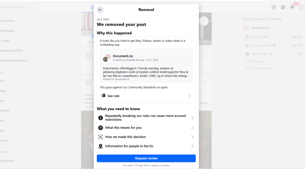 Epstein-artikkelen ble også fjernet umiddelbart, og den samme meldingen fra Facebook dukket opp: