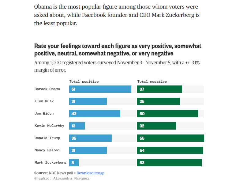 I 2022 fant en NBC News meningsmåling at Obama er den mest populære personen som velgerne ble spurt om, mens Facebook-grunnlegger og administrerende direktør Mark Zuckerberg er den minst populære.